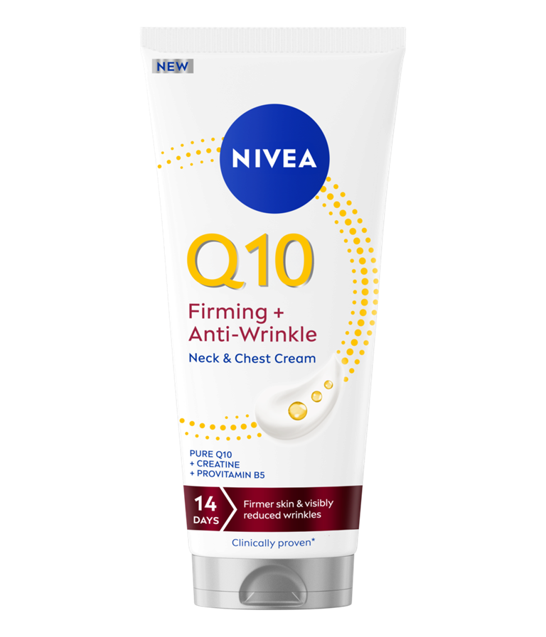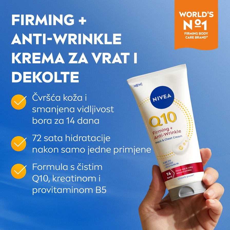 NIVEA Q10 krema protiv bora za učvršćivanje kože vrata i dekoltea s formulom koja sadrži čisti koenzim Q10, kreatin i provitamin B5. Za 14 dana smanjuje vidljivost sitnih linija i bora.