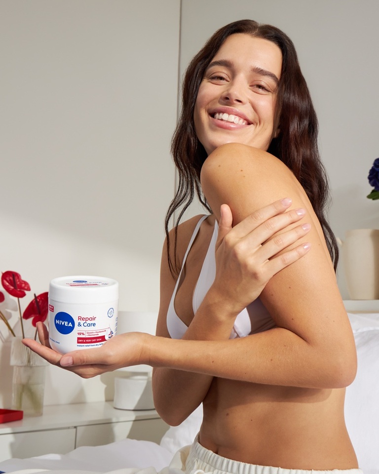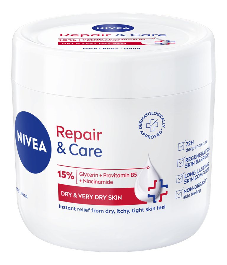 NIVEA Repair & Care univerzalna krema pruža trenutačno olakšanje za suhu kožu uz 72 sata hidratacije. Formula s 15 % glicerina, provitaminom B5 i niacinamidom jača kožnu barijeru. Hipoalergena, nemasna i brzo upijajuća, sigurna je za djecu stariju od 3 godine. Za dugotrajan osjećaj ugode!
