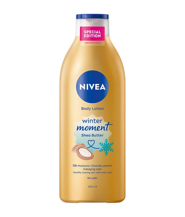 NIVEA Winter Moment losion za tijelo pruža koži 72-satnu dubinsku njegu i hidrataciju. Obogaćen serumom za dubinsku njegu kože i shea maslacem čini kožu svilenkasto glatkom na dodir. Za zdrav izgled kože pri svakoj uporabi.
