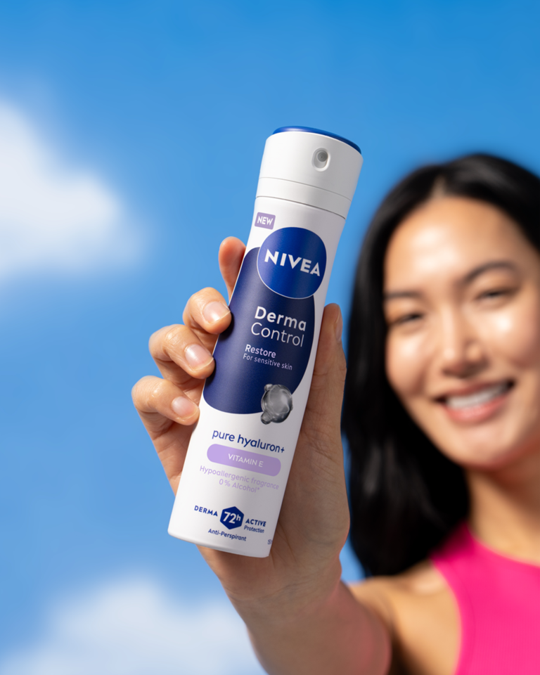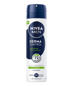 NIVEA Derma Control Restore antiperspirant u spreju, s čistim hijaluronom i vitaminom E, umiruje iritiranu kožu nakon brijanja i pruža 72 sata zaštite od prekomjernog znojenja, vlage i neugodnih mirisa. Za osjetljivu kožu.
