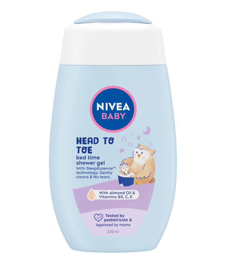 NIVEA BABY Head to Toe Bed Time gel za tuširanje nježno čisti hipoalergenom formulom bez suza za meku kosu i kožu. Proizveden od 95 % prirodnih sastojaka, ovaj dječji gel za tuširanje od glave do pete čisti vlasište, kosu i kožu. Sadržava SleepEssenceTM miris koji pomaže opuštanju bebe za dobar san.