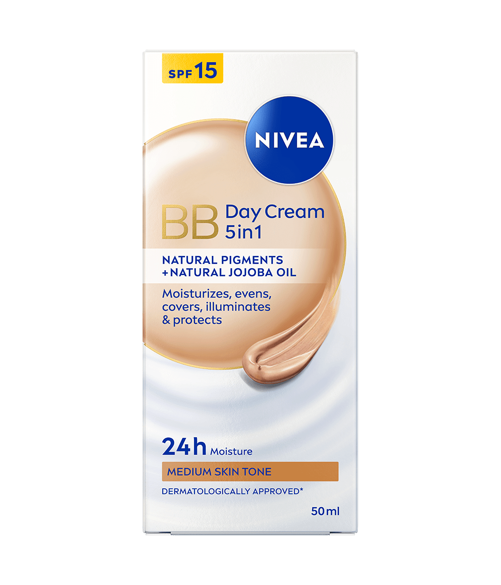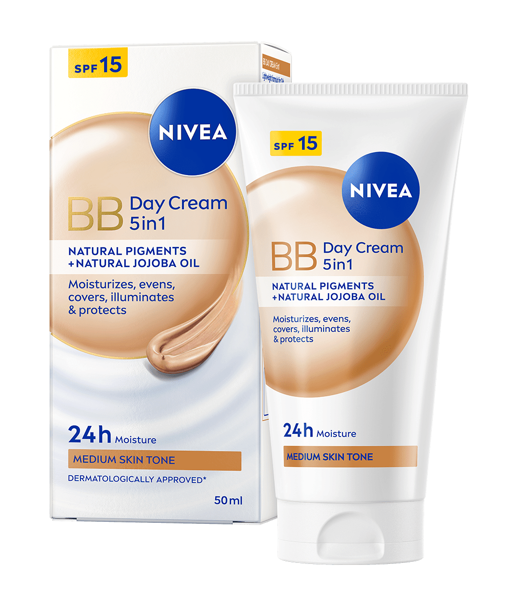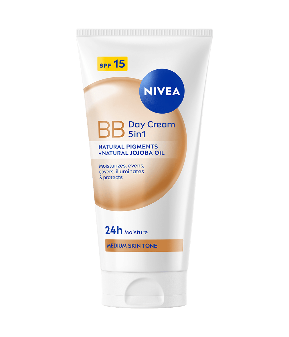 NIVEA BB dnevna krema 5u1 je savršen izbor za vašu kožu. Lagana formula za 24 sata hidratacije i prirodno ujednačen, blistav ten. Prekriva nepravilnosti kao što su prištići, tragovi umora i tanke linije, te ujedno štiti kožu od štetnog utjecaja sunčeve svjetlosti zahvaljujući SPF 15.