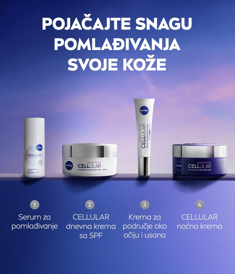Doživite revoluciju u pomlađivanju kože uz NIVEA Cellular Epigenetics serum za pomlađivanje s epigenetskim anti-age sastojkom Epicelline®, koji znanstveno dokazano patentiranom tehnologijom Age Clock pomlađuje kožu za 2 tjedna.*