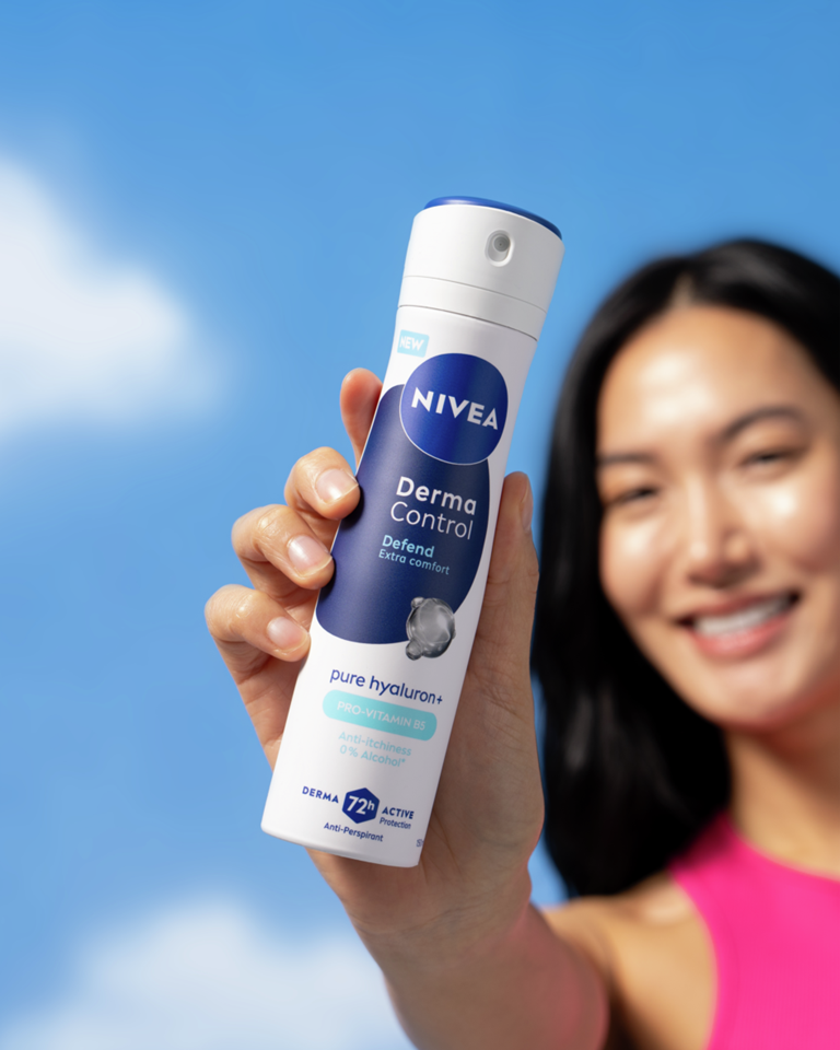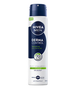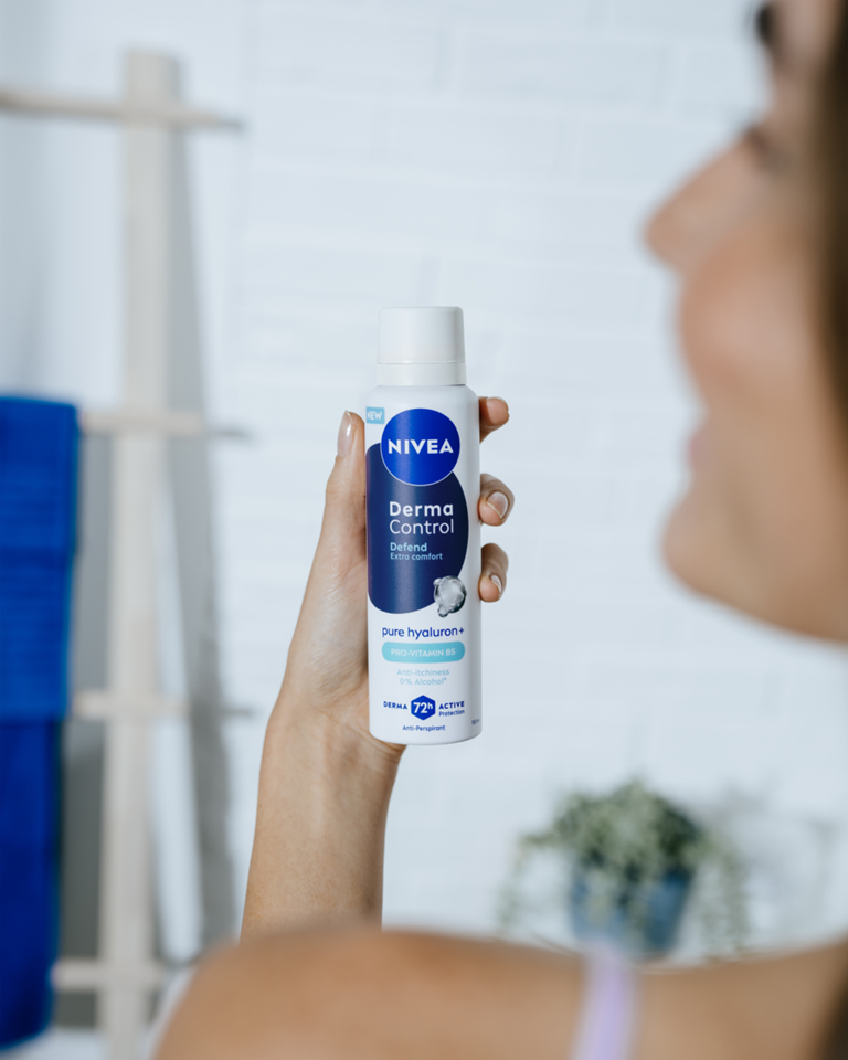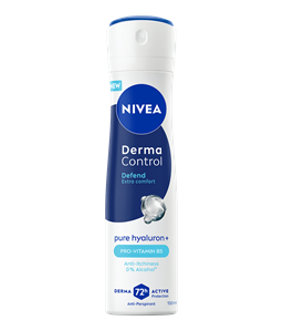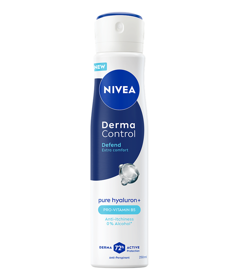 NIVEA Derma Control Defend antiperspirant u spreju, s čistim hijaluronom i provitaminom B5, pruža 72 sata zaštite od prekomjernog znojenja, vlage i neugodnih mirisa, a istovremeno štiti kožu od iritacija nakon brijanja.