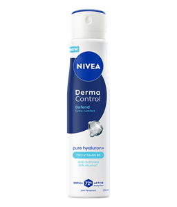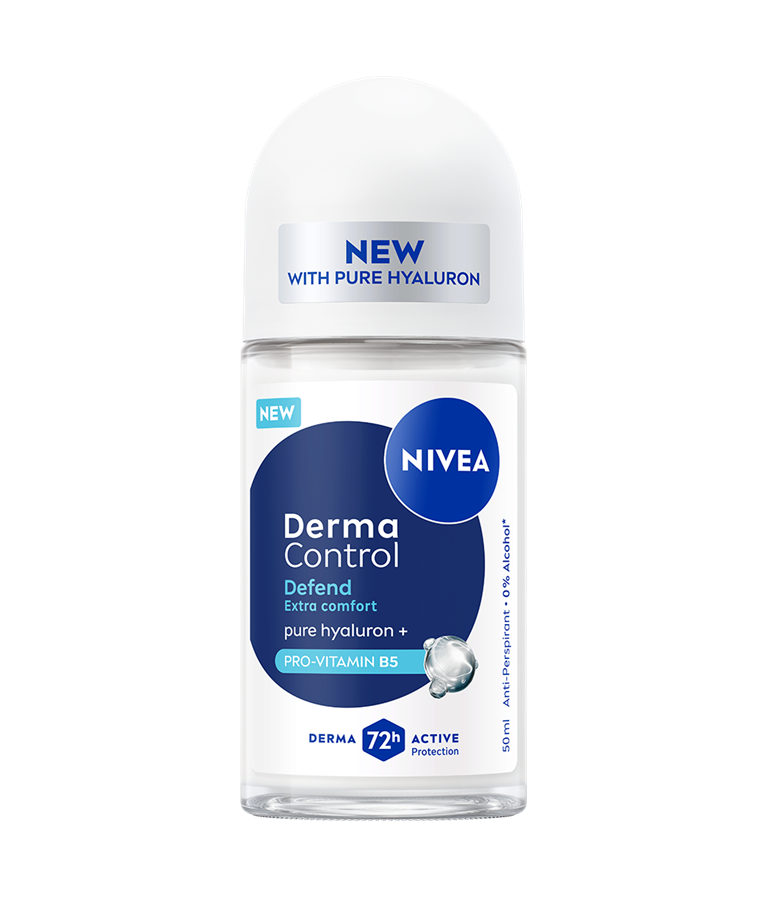 NIVEA Derma Control Defend roll-on antiperspirant, s čistim hijaluronom i provitaminom B5, pruža 72 sata zaštite od prekomjernog znojenja, vlage i neugodnih mirisa, a istovremeno štiti kožu od iritacija nakon brijanja.
