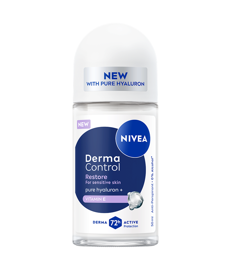 NIVEA Derma Control Restore roll-on antiperspirant, s čistim hijaluronom i vitaminom E, umiruje iritiranu kožu nakon brijanja i pruža 72 sata zaštite od prekomjernog znojenja, vlage i neugodnih mirisa. Za osjetljivu kožu.