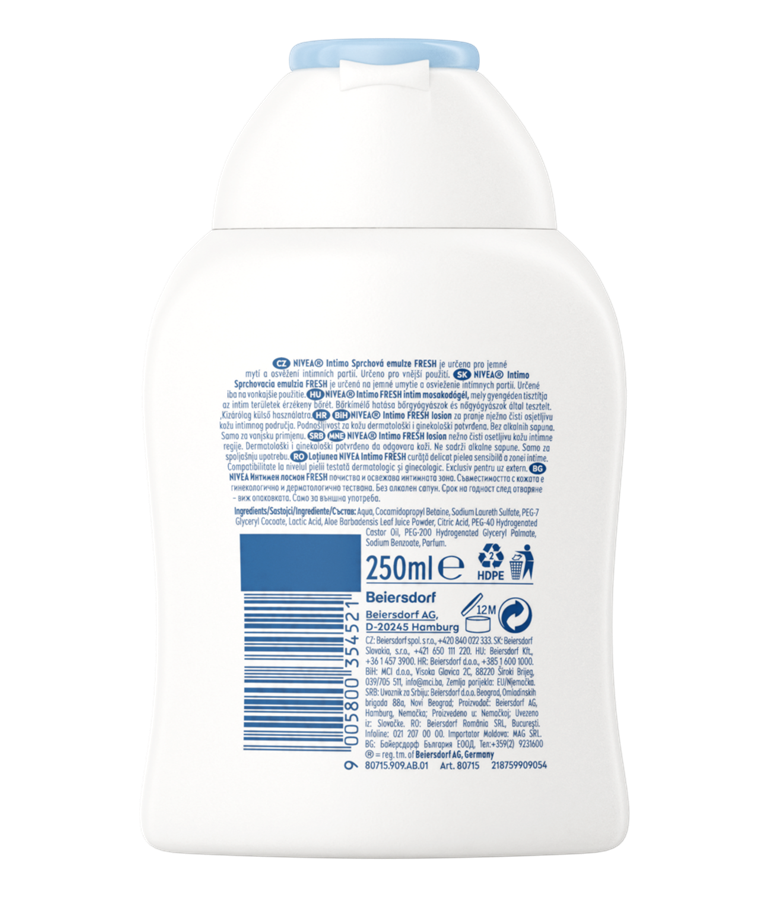 Intimo FRESH COMFORT losion sadrži umirujuću aloe veru, blagi miris bijelog čaja i mliječnu kiselinu, pružajući intimnom području svu svježinu i njegu koja mu je potrebna