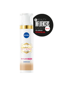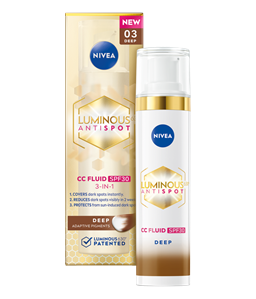 NIVEA Luminous CC fluid SPF 30 3-u-1 u svijetloj nijansi prekriva i smanjuje tamne mrlje te sprječava nastanak novih - za vidljive rezultate u 2 tjedna*. Formula s pigmentima se prilagođava boji kože za prirodan i ujednačen ten.