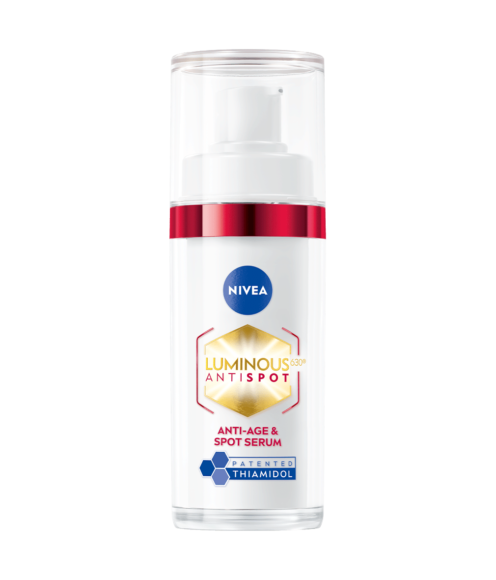 NIVEA Luminous630 Anti-age serum protiv tamnih mrlja, s iznimno učinkovitim patentiranim sastojakom Thiamidolom®, smanjuje staračke pjege nastale tijekom 10 godina te jača strukturu kože i čini je čvršćom i gušćom te popunjava čak i duboke bore za 7 dana.