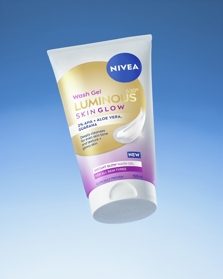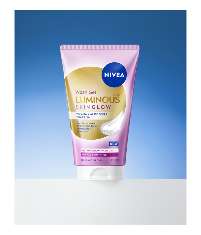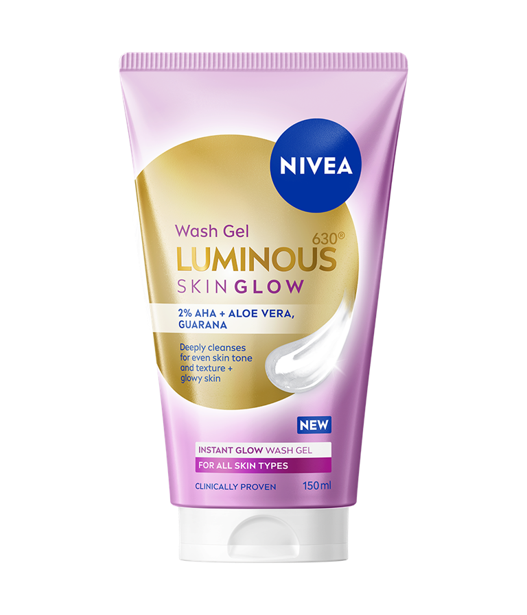 NIVEA LUMINOUS630® SKIN GLOW gel za čišćenje lica dubinski čisti kožu i djeluje na tri dimenzije: protiv sjaja, za obnovu kože te za ujednačen, trenutačno blistav ten. Formula s 2 % AHA kiselina, aloe verom i guaranom, za čistu i blistavu kožu.