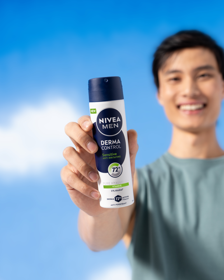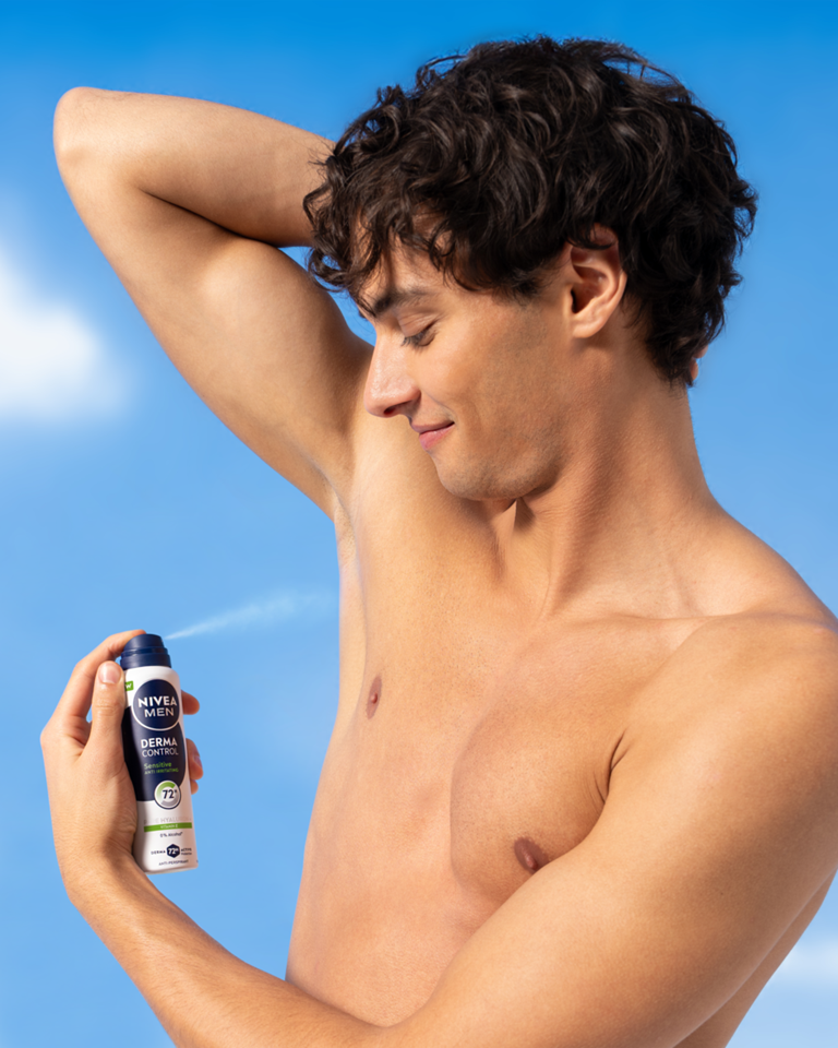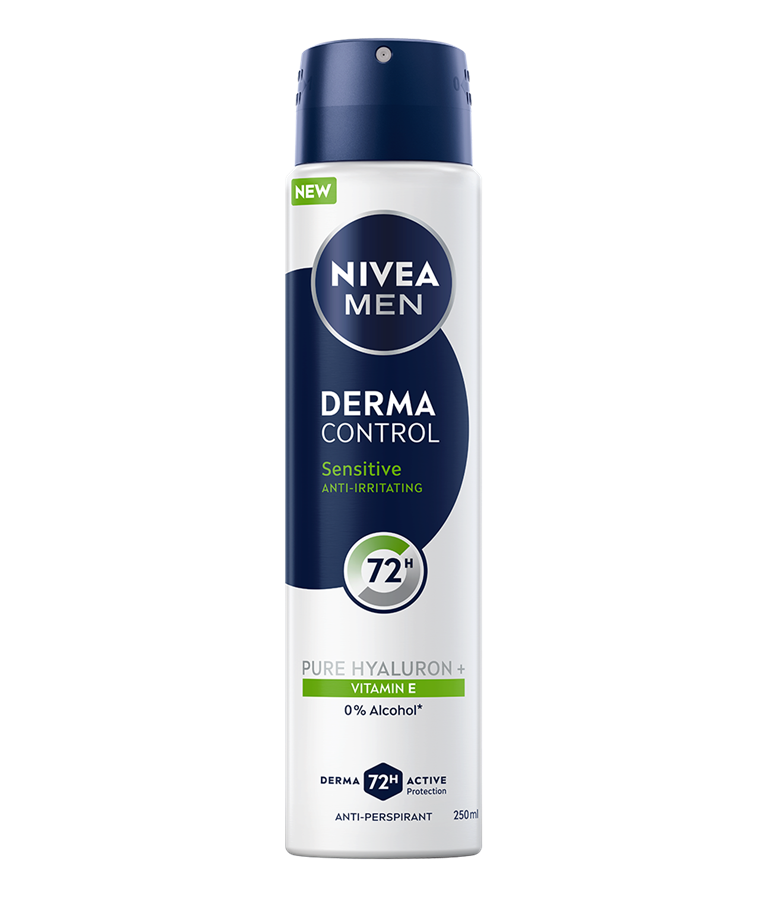 NIVEA MEN Derma Control Sensitive antiperspirant u spreju, s čistim hijaluronom i vitaminom E, pruža 72 sata zaštite od prekomjernog znojenja, vlage i neugodnih mirisa, a istovremeno štiti od iritacija i njeguje osjetljivu kožu.