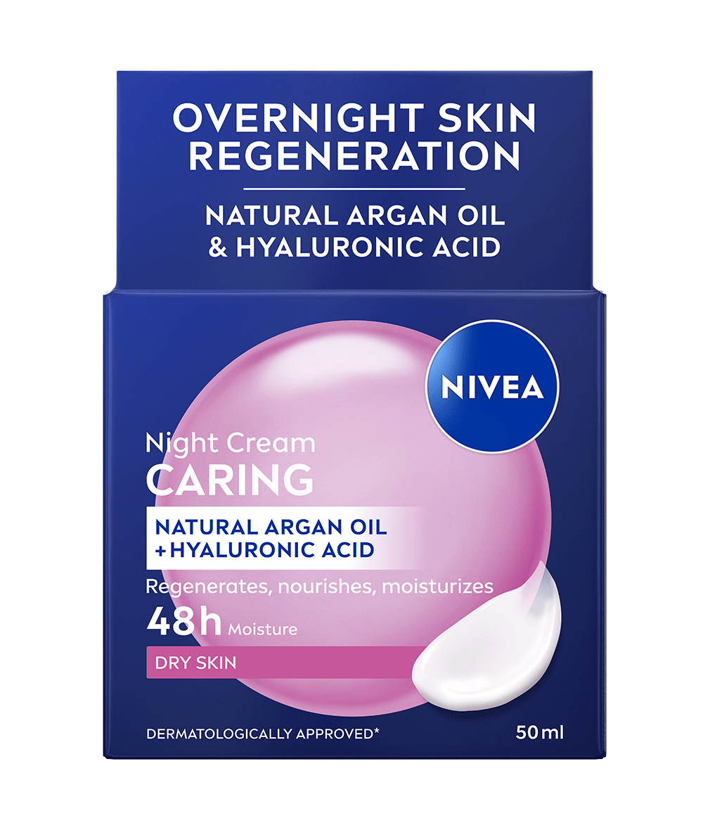 NIVEA njegujuća noćna krema s prirodnim arganovim uljem za suhu kožu intenzivno hidratizira kožu, čini je mekom i posebno glatkom, te potiče prirodan proces obnove kože tijekom noći.