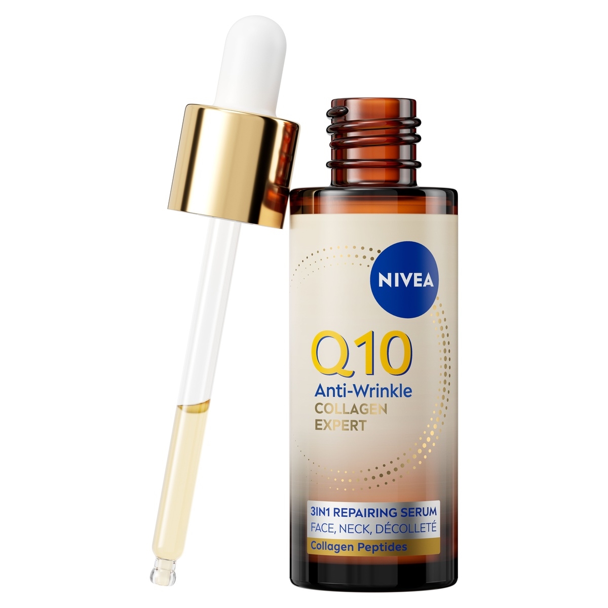 NIVEA Q10 Anti-Wrinkle Collagen Expert 3u1 serum definira konture lica, pomaže ojačati zaštitni sloj kože i zadržava vlagu u koži do 24 sata. S 5 % aktivnim kompleksom s kolagenskim peptidima, čistim Q10 i ceramidom.