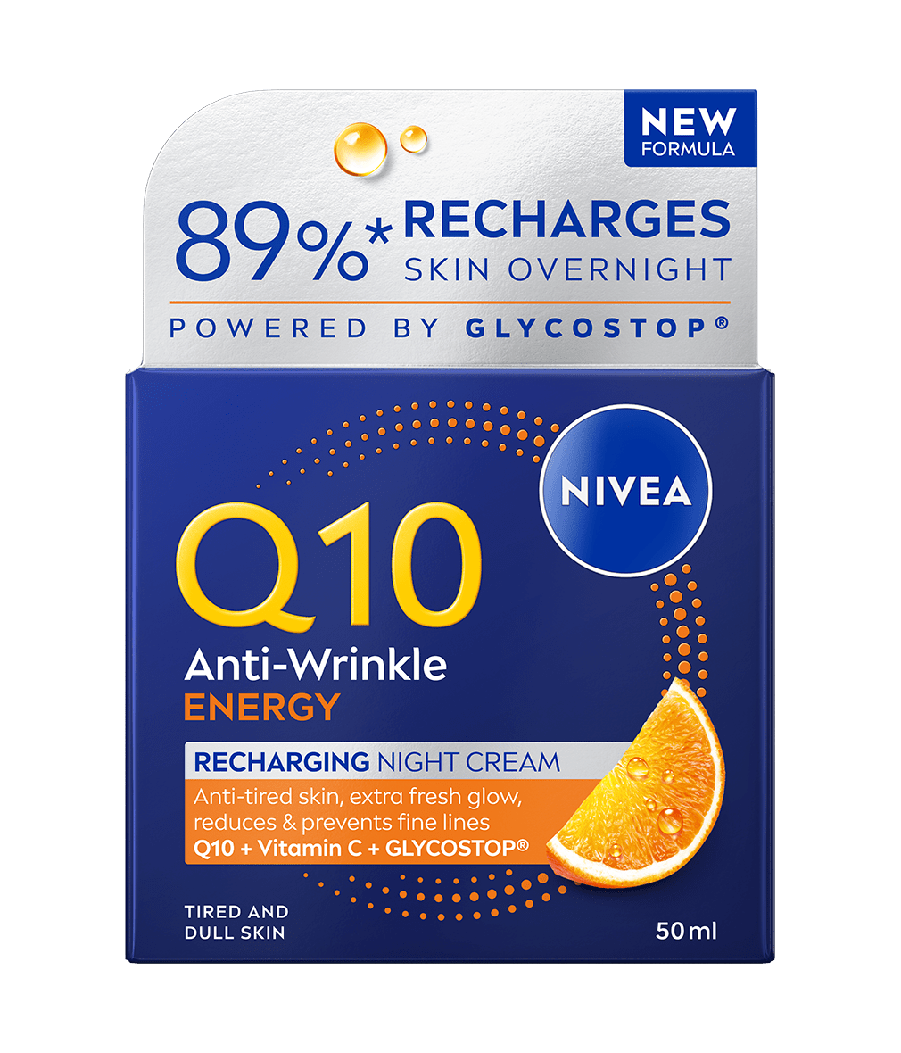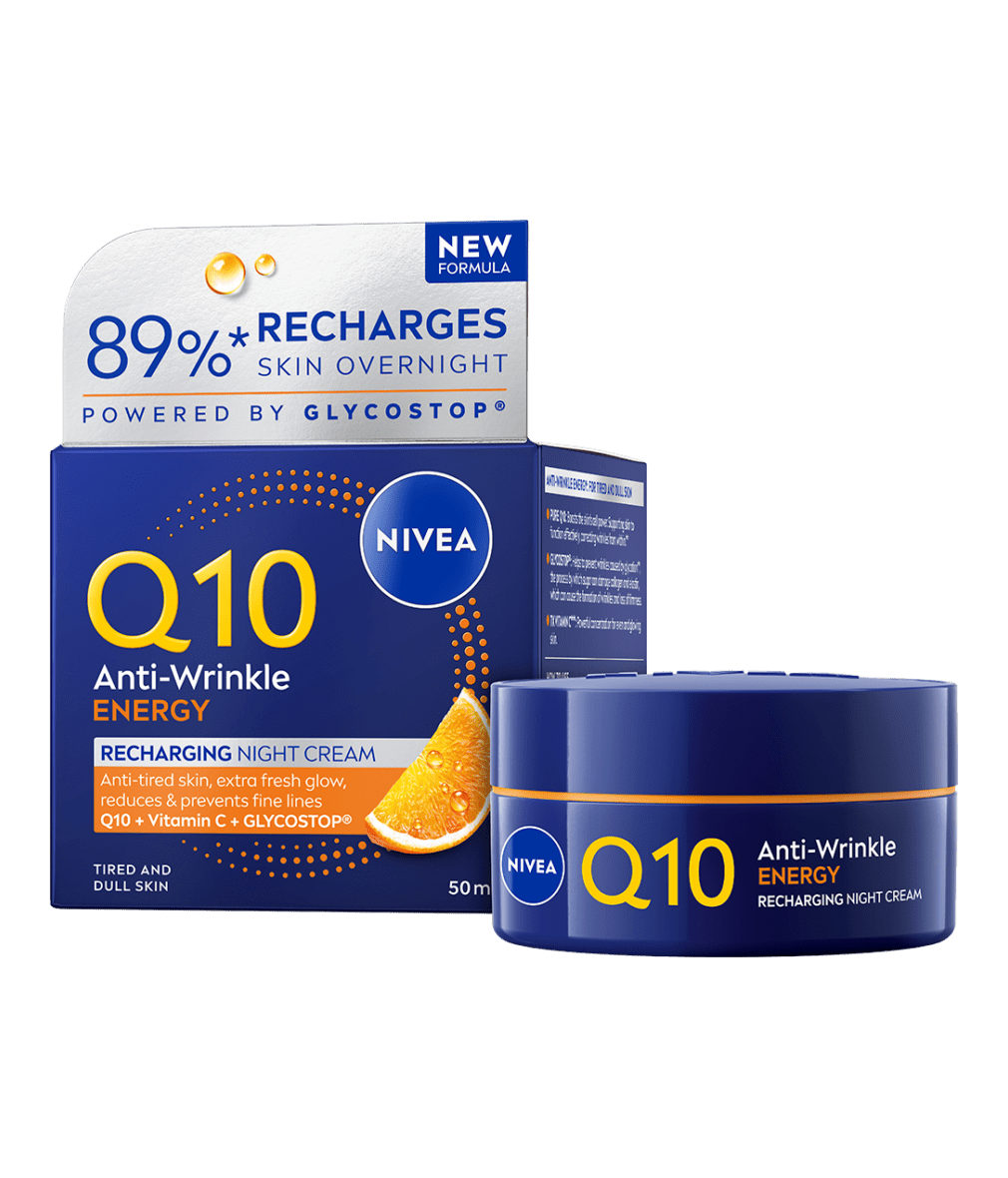 NIVEA Q10 Energy noćna krema protiv bora obogaćena koenzimom Q10, vitaminom C i GLYCOSTOP® za umornu kožu bez sjaja. Ojačava prirodnu barijeru kože i djeluje na glavne uzroke umorne kože.
