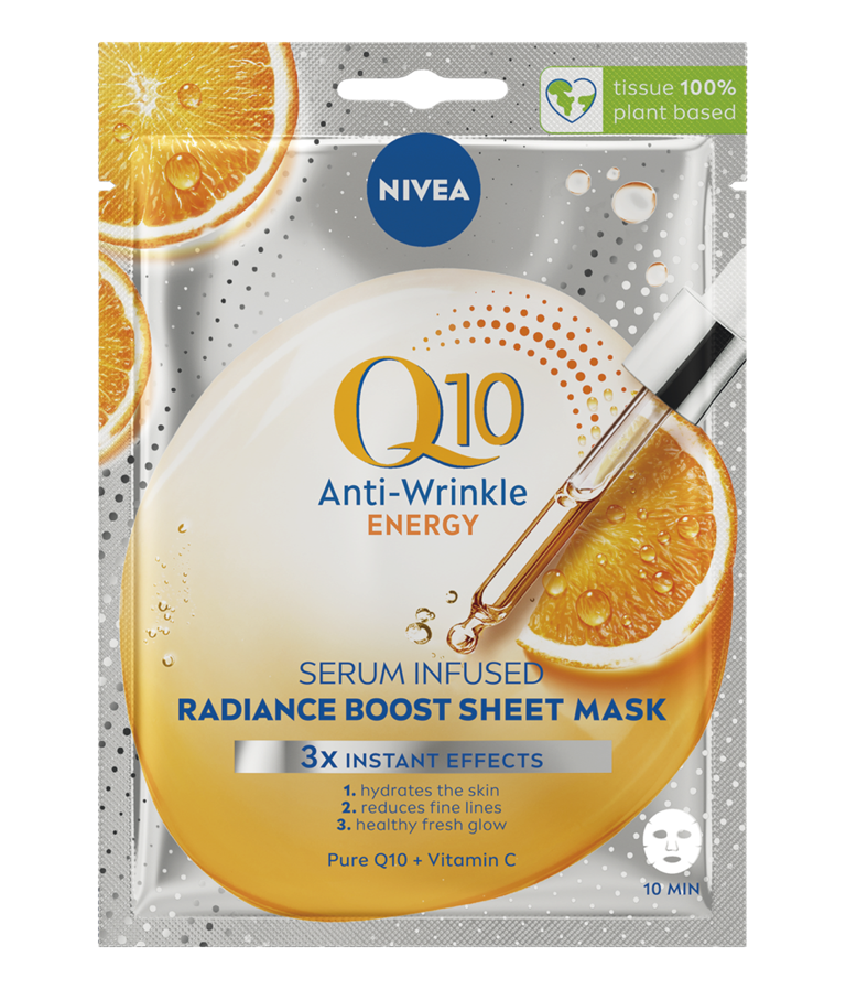 Revitalizirajte umornu kožu bez sjaja uz NIVEA Q10 Energy sheet masku s dodatkom seruma! Sadrži čisti koži identičan koenzim Q10 i vitamin C. Za osvježenu, primjetno glatku kožu punu energije.