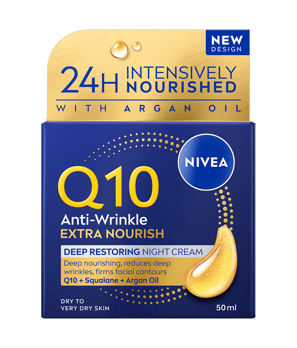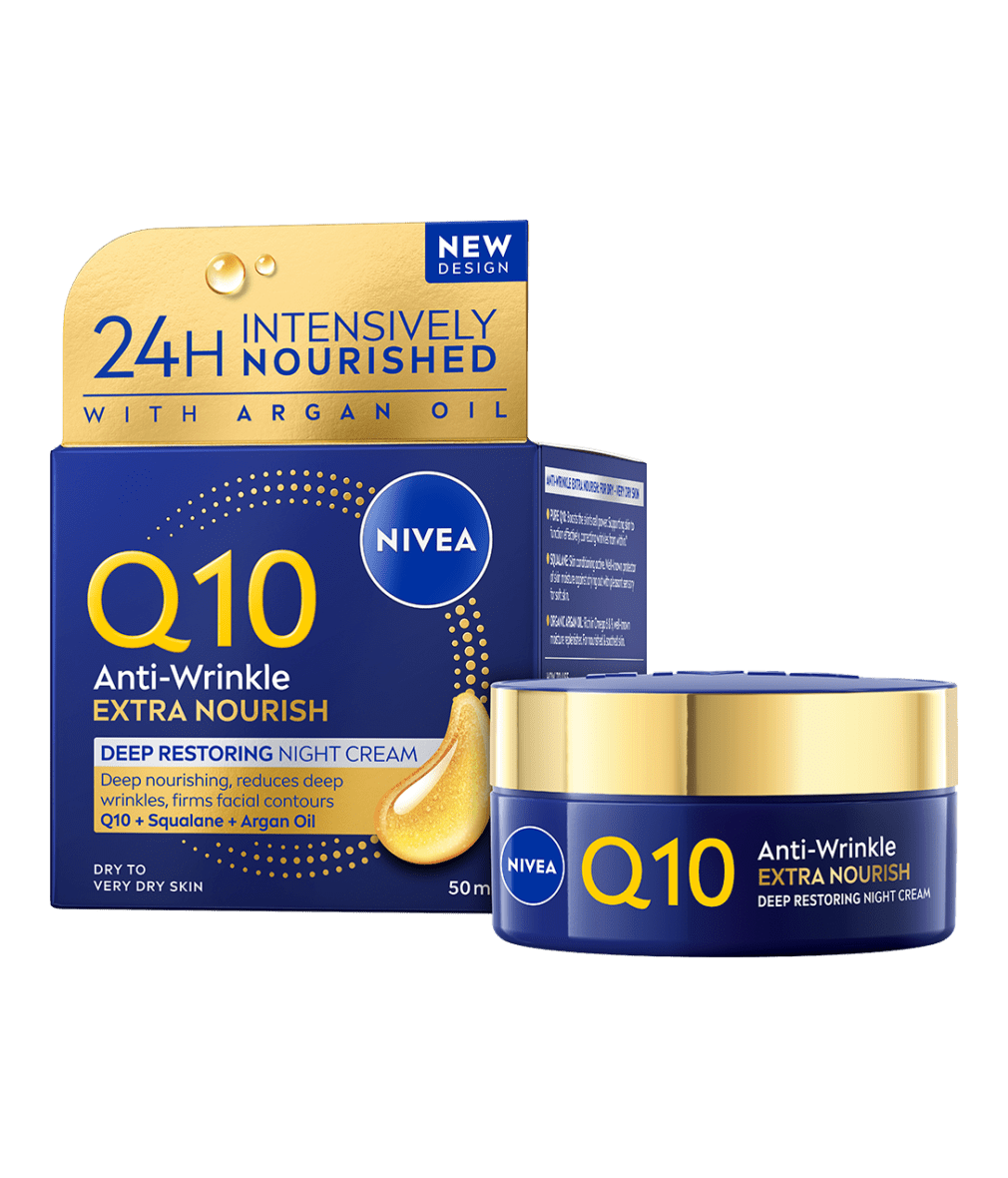 NIVEA Q10 Extra Nourish noćna krema protiv bora obogaćena čistim koenzimom Q10, organskim arganovim uljem i skvalanom posebno je namijenjena za potrebe suhe i vrlo suhe kože. Za 24 sata intenzivne hidratacije i osjetno čvršću i otporniju kožu u 2 tjedna.