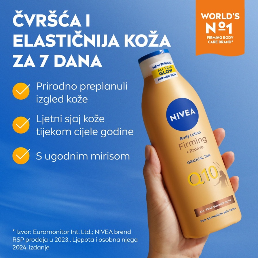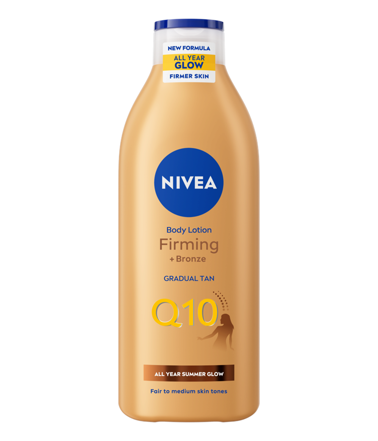 NIVEA Q10 Firming + bronze losion za tijelo s koenzimom Q10 poboljšava elastičnost kože unutar 7 dana te pruža prirodno preplanuli izgled. Uživajte u brončanom tenu kad god poželite.