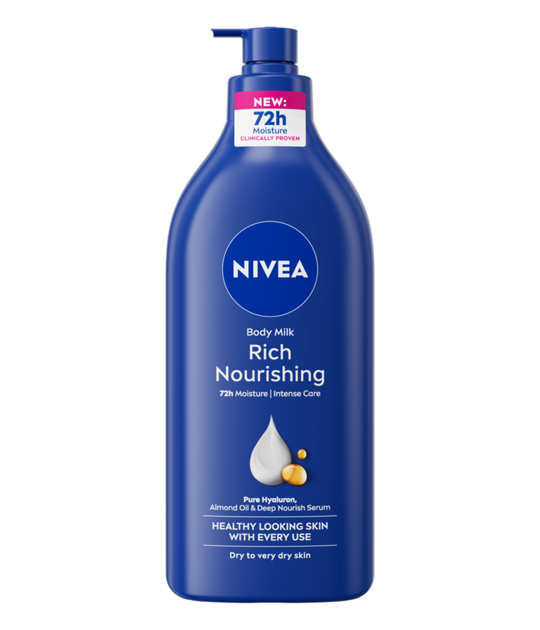 NIVEA Rich Nourishing mlijeko za tijelo pruža koži 72-satnu hidrataciju i dubinsku njegu. Obogaćeno čistim hijaluronom, bademovim uljem i serumom za dubinsku hidrataciju čini kožu osjetno mekom i glatkom na dodir. Za zdrav izgled kože pri svakoj uporabi.