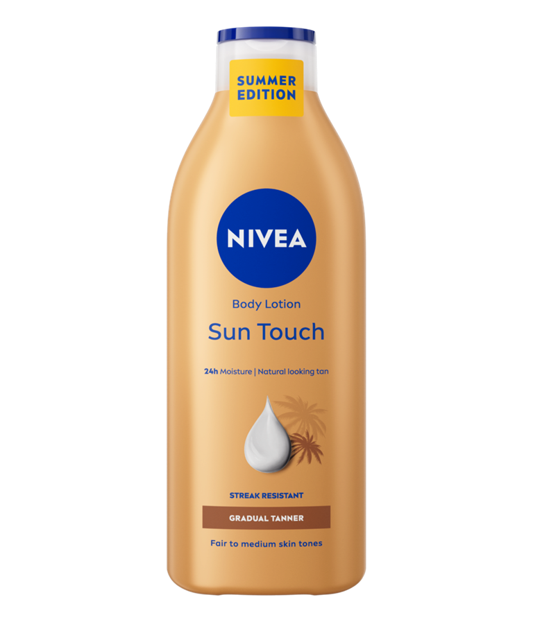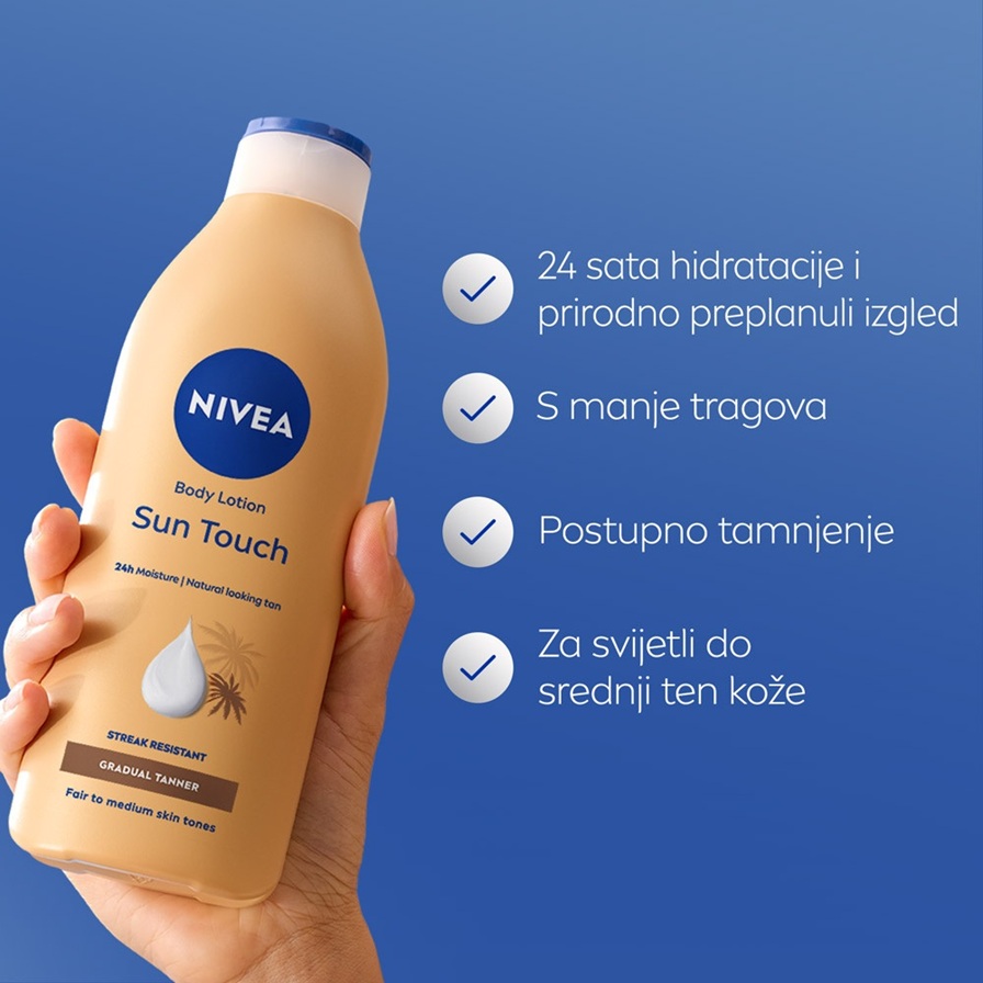 NIVEA Sun Touch losion za tijelo za postupno tamnjenje pruža jednakomjeran, prirodno preplanuli izgled kože - s manje tragova. Istovremeno je dubinski hidratizira i čini baršunasto mekom.